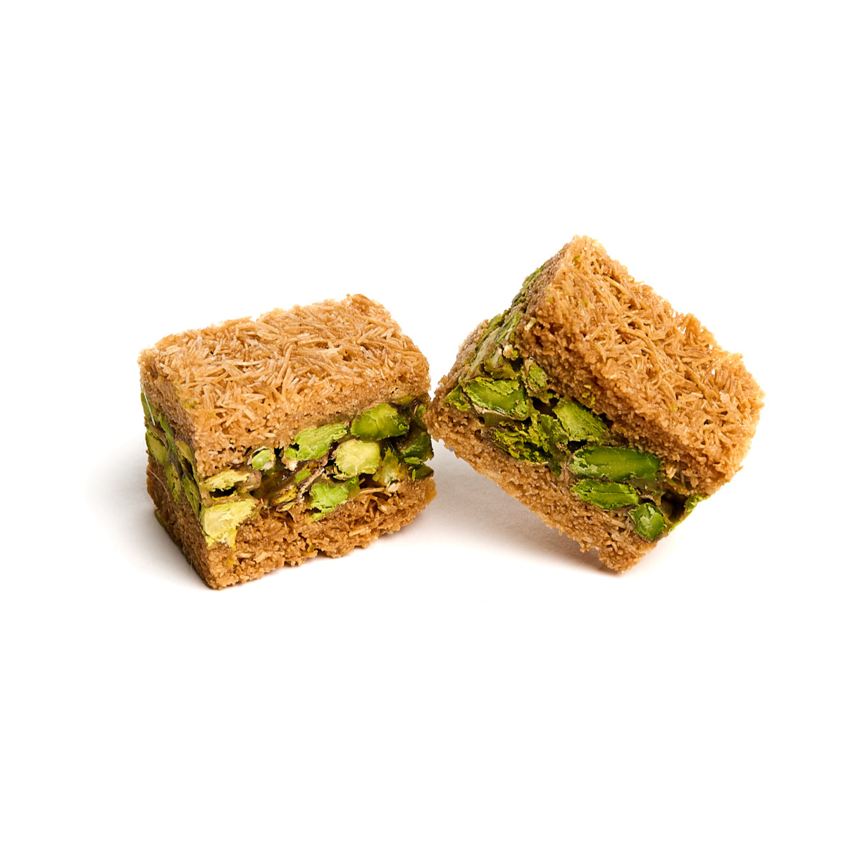 Basma with pistachio and kunafa – a delicious dessert where crispy kunafa envelops a rich pistachio filling. The golden surface of finely shredded filo dough provides a lovely crunch, while the aromatic pistachio provides a perfectly balanced sweetness. A simple and tasty slice of the Middle East!