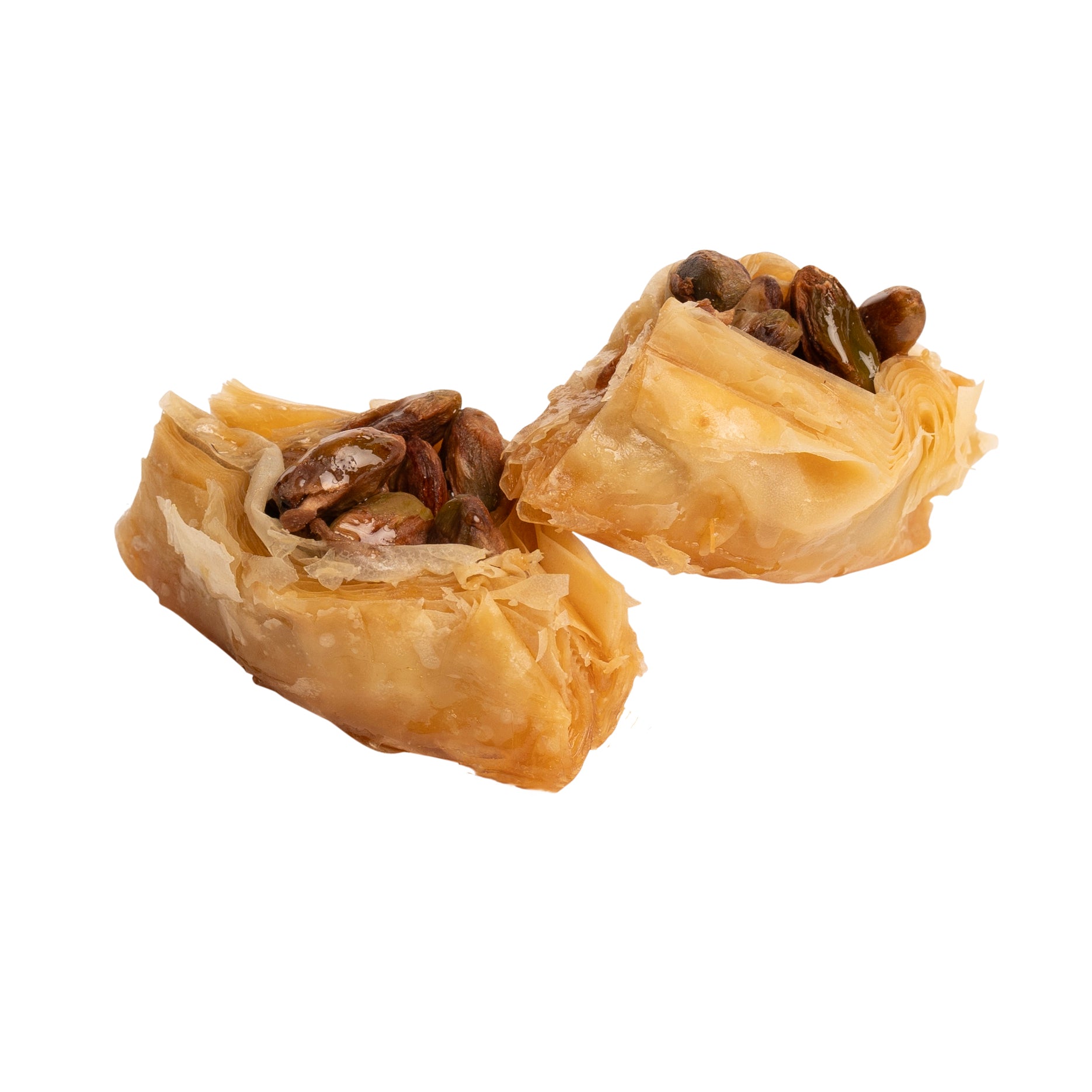 Baklawa with pistachio filling – a delicacy that combines crispy filo pastry with a rich and flavorful pistachio filling. Each layer of the thin dough is carefully brushed with butter and baked to golden perfection, creating a wonderfully crispy texture. The nutty and aromatic pistachio filling provides a balanced sweetness and a unique taste experience. Perfect for brightening up festive occasions or as a luxurious dessert. Ready-baked and ready to enjoy – a taste journey to the Middle East in just one bite!
