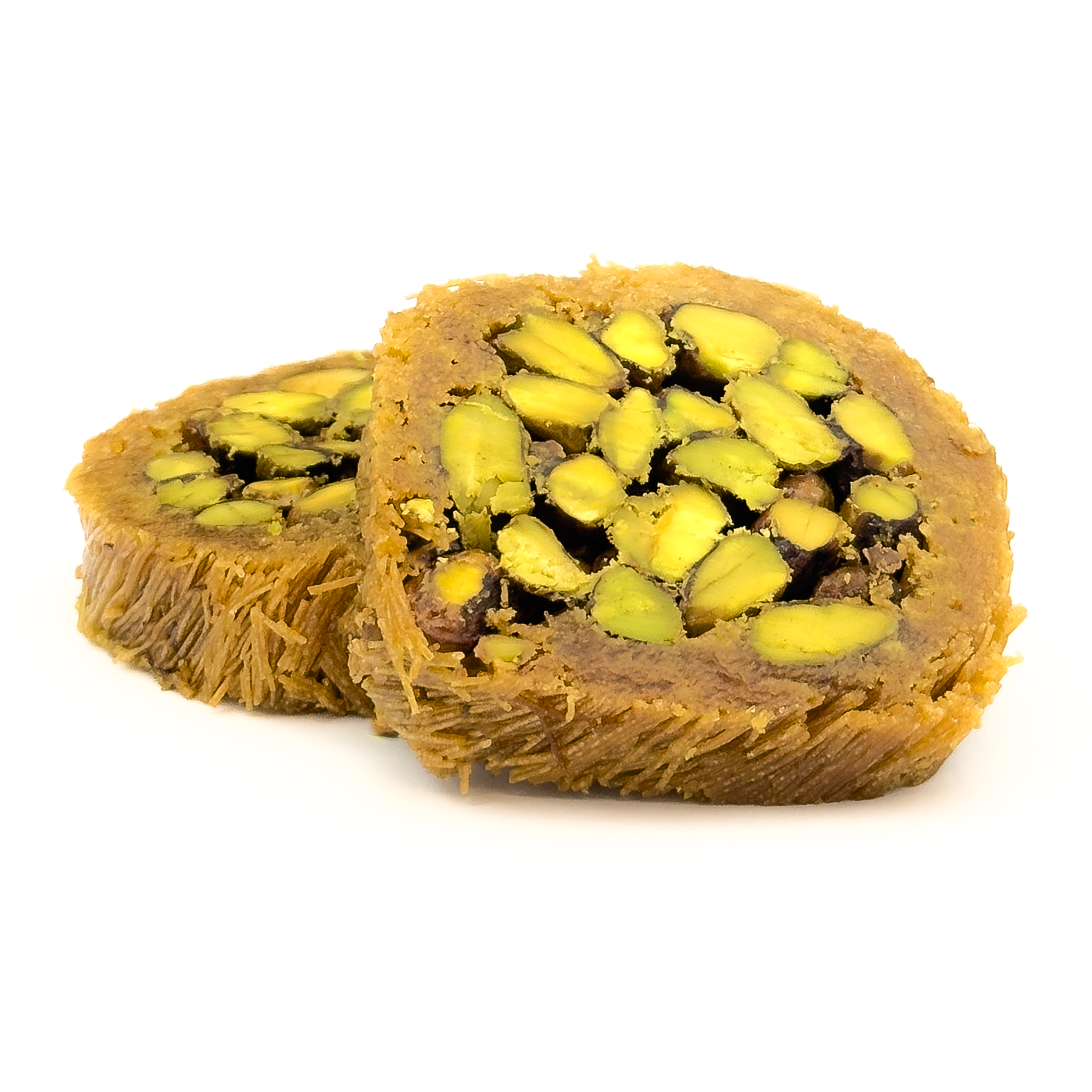 Mabruma with pistachio filling is an exclusive delicacy that combines crispy kataifi dough with a rich and aromatic pistachio filling. Each roll of the thin dough is gently buttered and baked to golden perfection, resulting in a crispy surface and a soft interior. The generous pistachio filling adds a balanced sweetness and a distinct nuttiness that makes every bite an unforgettable experience. Perfect to offer at festive occasions or as a luxurious dessert. A taste journey to the heart of the Middle East.